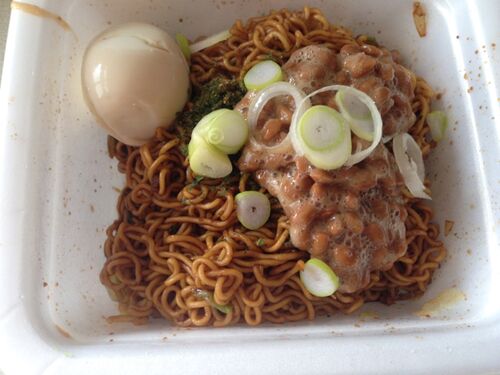 納豆焼きそばを作ってみました。 おでんの残り物の煮卵を添えて。 と言っても、カップ焼きそばに納豆をかけただけ。 しか~し、これが絶妙にうま~いのでした。 最近の味の新発見です。 と、検索してみるとあるわあるわ、納豆焼きそばレシピ。 知らぬは私だ…